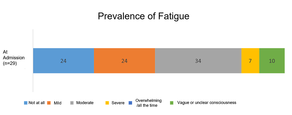 Of the 29 patients evaluated at admission, 48% had no or mild fatigue, while 41% experienced moderate to severe fatigue. 10% felt appeared vague or had unclear consciousness.