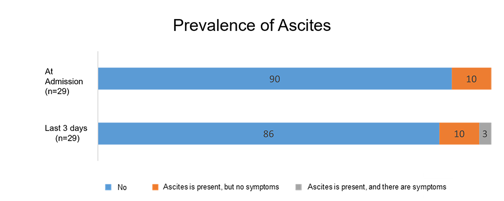 Of the 29 patients evaluated at admission, 0% had symptoms due to ascites.Of the 29 patients evaluated in the 3 days before passing away, 96% had no ascites or showed no symptoms related to it, and 3% showed symptoms due to ascites.