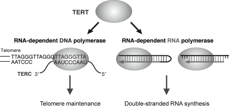 Telomerase is a ribonucleoprotein complex that elongates telomeres. Human telomerase reverse transcriptase (TERT) is known as the catalytic subunit of telomerase and acts as an RNA-dependent DNA polymerase (RdDP), which synthesizes telomere DNA repeats from an RNA template TERC. Although the major function of TERT is believed to be telomere elongation, emerging evidences indicate that TERT exhibits various functions beyond telomere maintenance. We reported that TERT has an RNA-dependent RNA polymerase (RdRP) activity and synthesizes double-stranded RNA (dsRNA) in either