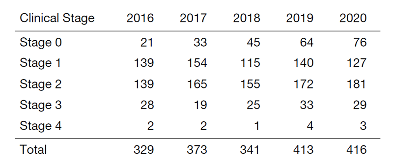 Thirteen immediate breast reconstruction surgeries were included. Of the patients with primary breast cancer, 58 (14%) underwent primary systemic therapy. The types and number of operative procedures performed in 2020 are shown in Table 2. The rate of breast-conserving surgery was 44% (183/416). Sentinel node biopsy was performed on 351 patients, and 318 patients were spared from ALND. The number of immediate breast reconstruction surgeries using tissue expanders decreased in 2019 because the tissue expanders were recalled due to breast implant-associated anaplastic large cell lymphoma; however, there was a recovery the number of surgeries in 2020 (2018, 18 cases; 2019, 5 cases).
