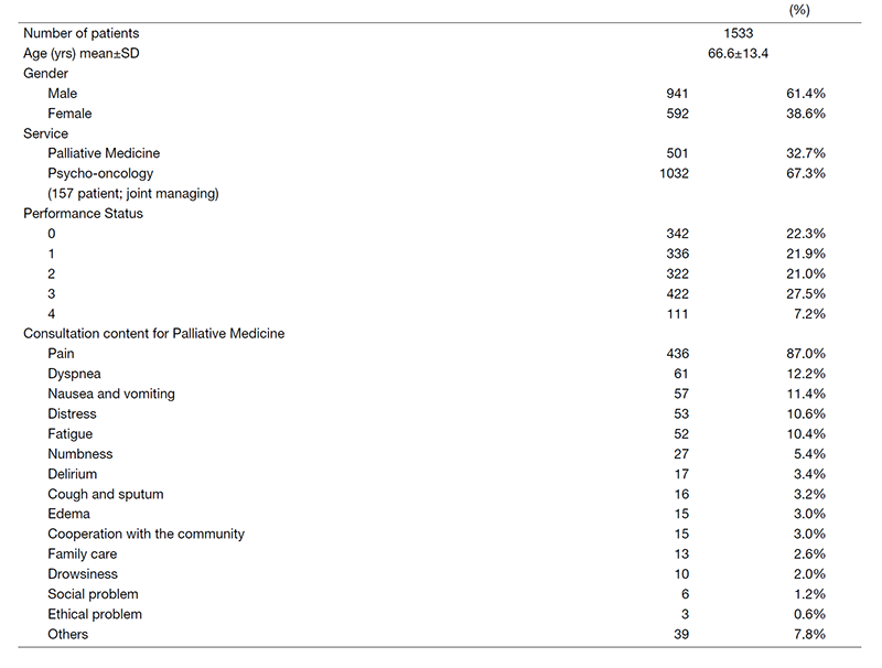 This team consists of physicians, psycho-oncologists, nurses, dieticians, physiotherapists, and speech-language-hearing therapists. In the oncology section, our supportive care team takes a multidisciplinary approach for inpatients with various illnesses (Table 3).