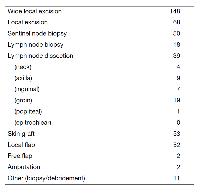 The department has four staff dermatologic oncologists, one chief resident and five residents. Our department is a high-volume center, where we have seen an average of 170 patients with malignant melanoma annually in the last 5 years (Table 1). At all times, approximately 14 patients are hospitalized to undergo surgery, chemotherapy, or radiation therapy. In 2022, 254 operations were performed including 143 operations under general anesthesia (Table 2). This is the result of the creation of a national network to develop treatment for malignant skin tumors, and nivolumab, an anti-PD-1 antibody, was previously approved as a therapeutic agent for malignant melanoma in Japan for the first time in the world as a result of vigorous development of new drugs.