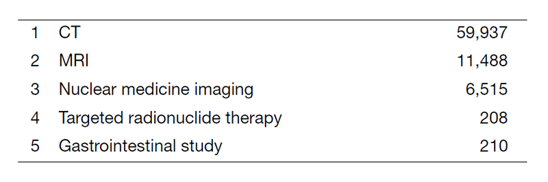 The Department of Diagnostic Radiology provides a wide range of modalities, including interventional radiology (IR), general radiology, computed tomography (CT), magnetic resonance imaging (MRI), mammography, and nuclear medicine imaging (Table 1).