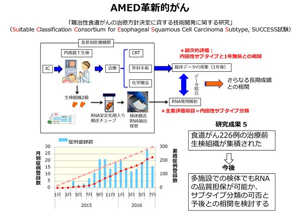 【食道がん】:食道扁平上皮がんの根治的化学放射線療法(根治的CRT)は低侵襲性な治療であるが、5年生存率が37%であるため、治療前効果予測と予後不良症例の本態解明が重要である。そこでIIからIII期の局所進行がんの治療前生検試料274症例を用いた網羅的な遺伝子発現解析を行った。治療開始時期によって107例と167例の2つのセットに分け、教師無しクラスター解析と転写因子ネットワーク解析により根治的CRTでの予後に相関したサブタイプの同定を行った結果、5つのサブタイプ(1a, 2a, 3b、5, 7)を見出し、サブタイプ1aはM1(間質型1)、2aはI(免疫活性化型)、5はM2(間質型2)および7はE(上皮型)と命名した。 各サブタイプで特異的に高発現する遺伝子から固有の分子経路を推定したところ、サブタイプM1では転写因子PRRX1による間質誘導の分子経路が、サブタイプM2では転写因子FOXE1による放射線抵抗性・薬剤抵抗性関連の分子経路が、サブタイプEでは転写因子SIM2による分化誘導の分子経路がそれぞれ活性化していることが予想された。H28年度は、予後が良いサブタイプEの分化形質やCDDP、放射線に対する感受性形質をSIM2が規定していることをin vitro およびin vivoで示した(Tamaoki M, et al., Cancer Sci. 2018)。さらにEタイプ以外の症例では、転写因子SIX1によってTGF-βの分子経路が活性化し、悪性基底細胞の自己複製を促し、分化を抑制し、放射線に抵抗性となることを示した(Nishimura T, et al., Cancer Sci. 2017)。以上のように、生物学的根拠を基にした診断薬の開発を着実に進めることができている。さらに、CRTによって細胞障害性T細胞が活性化している信号が誘導されるIサブタイプ(Tanaka Y, et al., PLoS One 2015)の患者に対する、免疫チェックポイント阻害剤の医師主導治験の準備を開始した。一方で、治療前生検による予知医療のための体外診断薬の開発については、2014から2016年度までAMED革新的がんの支援を受け、全国10施設から226例の治療前生検試料を集め(SUCCESS試験、下図)、予後良好なサブタイプEを治療前に分類するためのマイクロアレイを使用した我が国初の診断薬として、製薬会社と共同で開発を継続している(2017から2019年もAMEDの継続支援)。