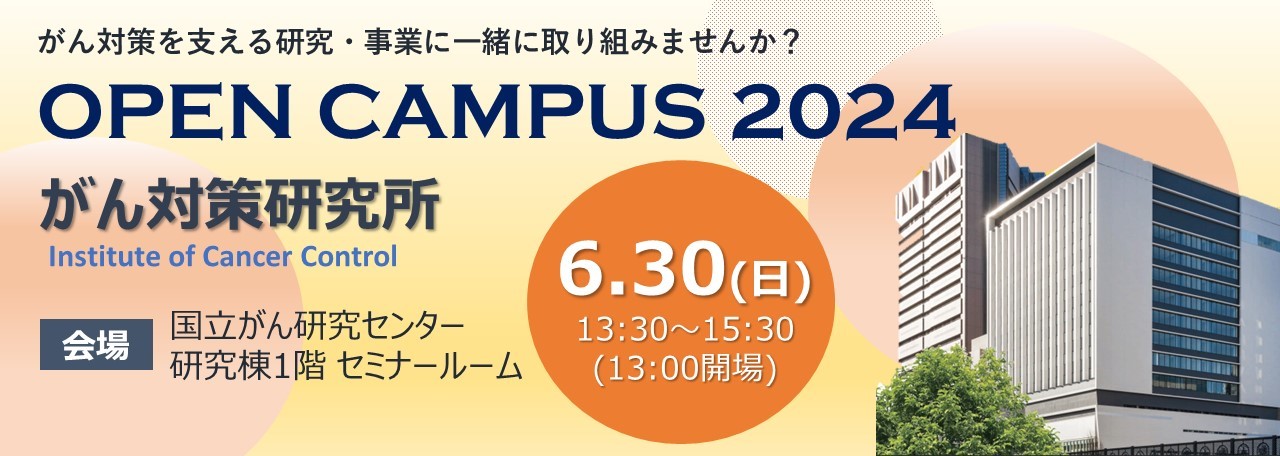 2024年6月30日(日曜日)に、若手研究者・大学院生を対象としたオープンキャンパスを開催します。がん対策研究所は「社会と協働して、エビデンスを創り、がん対策につなげ、すべての人に届ける」を使命として、疫学研究をはじめ、がんの予防・検診、行動科学、医療政策、国際政策など、日本および世界のがん対策について幅広く研究を行っています。当センターで研究をしながら学位を取得することも可能です。オープンキャンパス当日は、がん対策研究所で働く若手職員の生の声を聴くことができます。また今年度初めての試みとして、現地会場に加えてどなたでも参加しやすいオンライン会場も準備しました。是非ご参加ください。