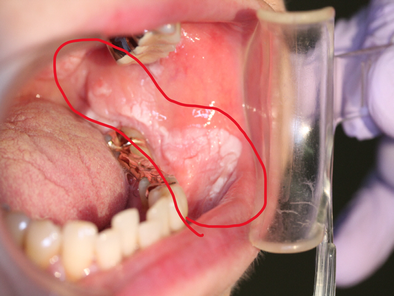 白板症は、舌や歯肉、頬粘膜などによくみられる白斑状のざらざらした病変で、この病変の約3~14.5%は、将来がん化するといわれています。こうした前がん病変(細胞が現状ではがんとはいえないが、将来がんに進行する確率が高い状態)としては、紅色(赤色)のつるっとした病変が特徴の紅斑症(紅色肥厚症)もあります。