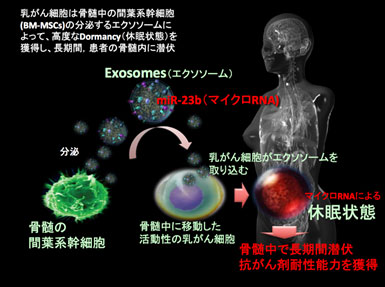 独立行政法人国立がん研究センター(理事長:堀田知光、所在地:東京都中央区、略称:国がん)は、乳がんの特徴である術後長期間を経ての再発、転移について、骨髄中の間葉系幹細胞が分泌する微小な小胞エクソソームが乳がん細胞の休眠状態を誘導していることを世界に先駆け明らかにしました。