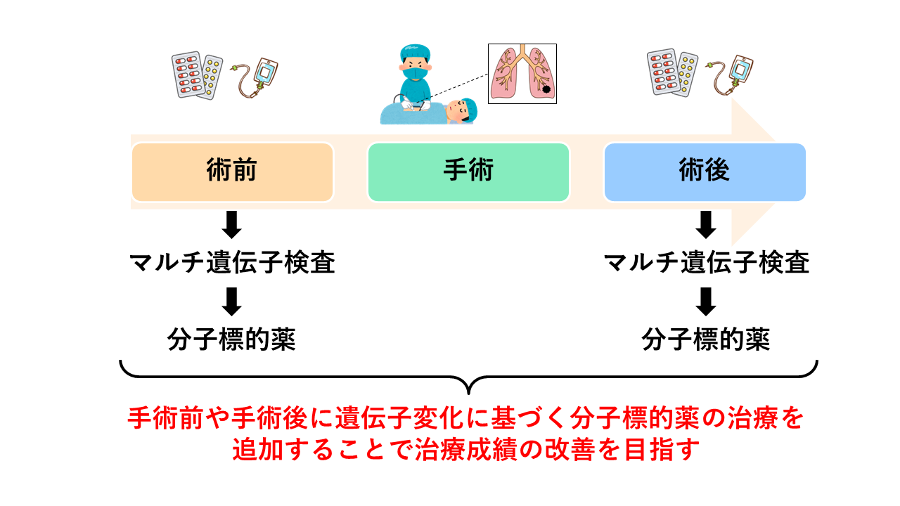 現在、早期(ステージ1、2、および3の一部)非小細胞肺がんに対する標準治療は手術です。国内における約20,000例を対象とした肺がん手術例の検討では、手術前後に従来の点滴の抗がん剤治療を追加した場合でも、ステージ2や3の非小細胞肺がん患者さんの半数以上が再発し、5年生存率は40~50%と、大腸がん、胃がん、乳がんと比べて満足のいく治療成績が得られていません。そのため、遺伝子変化を有する進行非小細胞肺がんにおける分子標的薬の優れた効果をふまえて、最近では、早期非小細胞肺がんの手術前後に遺伝子変化に基づいた治療を追加し、治療成績の改善につなげる研究が行われています。しかし、遺伝子変化を有する早期非小細胞肺がんの特徴はまだ明らかではなく、十分な遺伝子解析も行われていません。