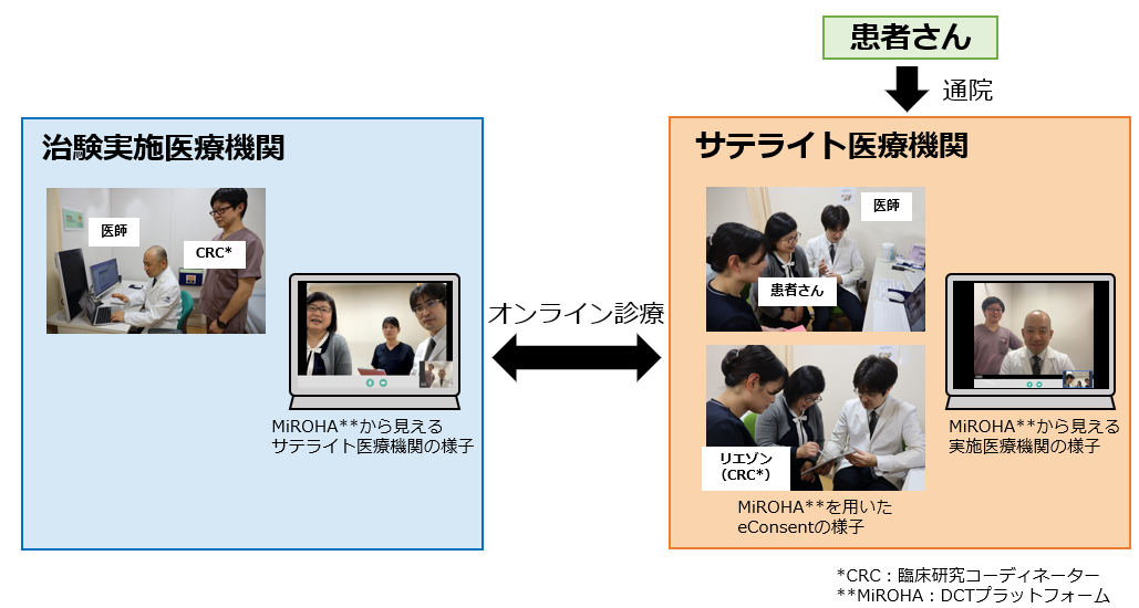 本試験は、中外製薬主導の進行固形がん患者さんを対象とした第I相臨床試験で、国立がん研究センター中央病院が治験実施医療機関として、DCTによる負担軽減効果が期待できる地域(国立がん研究センター中央病院への移動時間が片道120分を超える地域)にある大阪医科薬科大学病院がサテライト医療機関として参加しています。本試験の一部の来院では、患者さんは治験実施医療機関のかわりにサテライト医療機関に来院し、オンライン診療を活用して、臨床試験に関わる検査や評価を受けることができます。オンライン診療にはMICINが提供するDCTプラットフォーム「MiROHA(ミロハ)」を用いており、eConsentを活用した遠隔再同意も実施予定です。