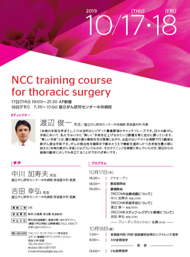 - 第4回NCC training course for thoracic surgeryを開催いたしました。11月15日初日はがんセンター中央病院で行っている診療や手術手技を中心に講義を行いました。関西を中心に6名のご参加をいただきました。11月16日二日目は昨日の座学に引き続き6名の参加者で午前・午後の手術見学を頂きました。次回のNCC training course for thoracic surgeryは日程が決まり次第アナウンスさせて頂きます。