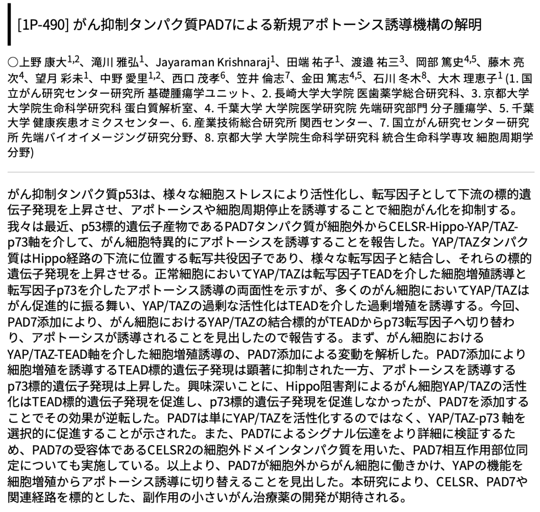 2025年12月 研究成果 第48回日本分子生物学会年会で、基礎腫瘍学ユニット研修生の上野 康大さんが「がん抑制タンパク質PAD7による新規アポトーシス誘導機構の解明」のタイトルでポスター発表を行い、「MBSJ Poster Award 2025」を受賞しました。